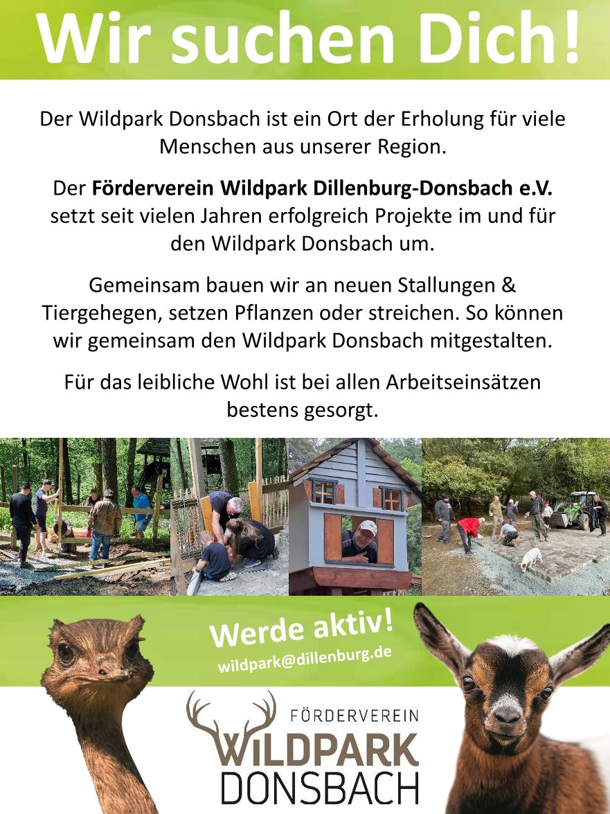 Der Förderverein Wildpark Dillenburg-Donsbach e. V. hat die Aufgabe die finanzielle Ausstattung zu verbessern, die Attraktivität zu steigern und auch für Erholungserlebnisse der Besuchenden zu sorgen. Nur dank den Mitgliedern des Vereins, ehrenamtlich Helfenden und Fördernden ist es möglich, den Wildpark Donsbach über den engen Finanzrahmen der Oranienstadt Dillenburg hinaus zu pflegen und Projekte umzusetzen.
